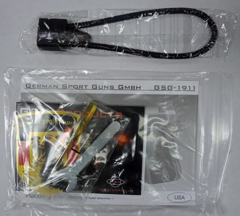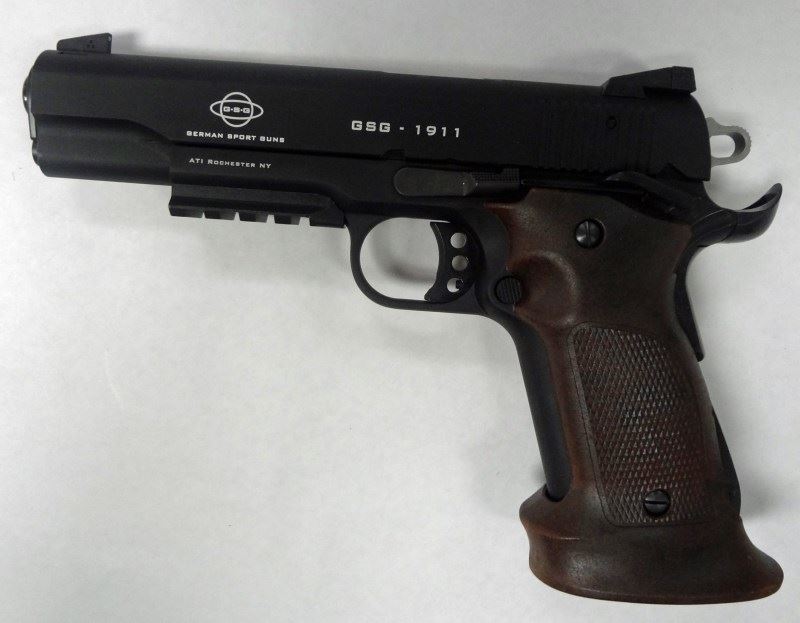 American Tactical Imports. GSG1911 Target . 22LR . New in box. Single action. Stock: molded walnut target style grips. Capacity: 10+1. Magazines 1. Safety: manual safety, magazine disconnect safety. Sights: fixed. Features: threaded barrel. EST:$400-$450