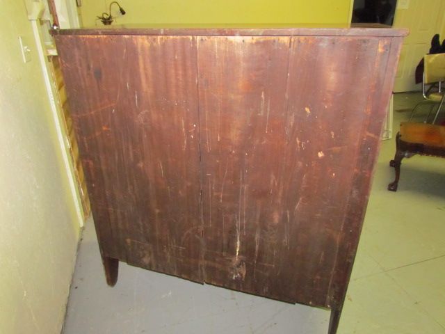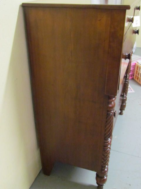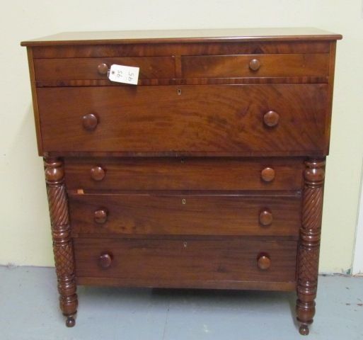 19th Century American Tall Chest with 2 small drawers over one large blanket drawer on stepout over 3 graduated drawers. Twisted and Diamond cut side post with original finish and board back - all drawers are dovedtailed 50" x 46" x 21"