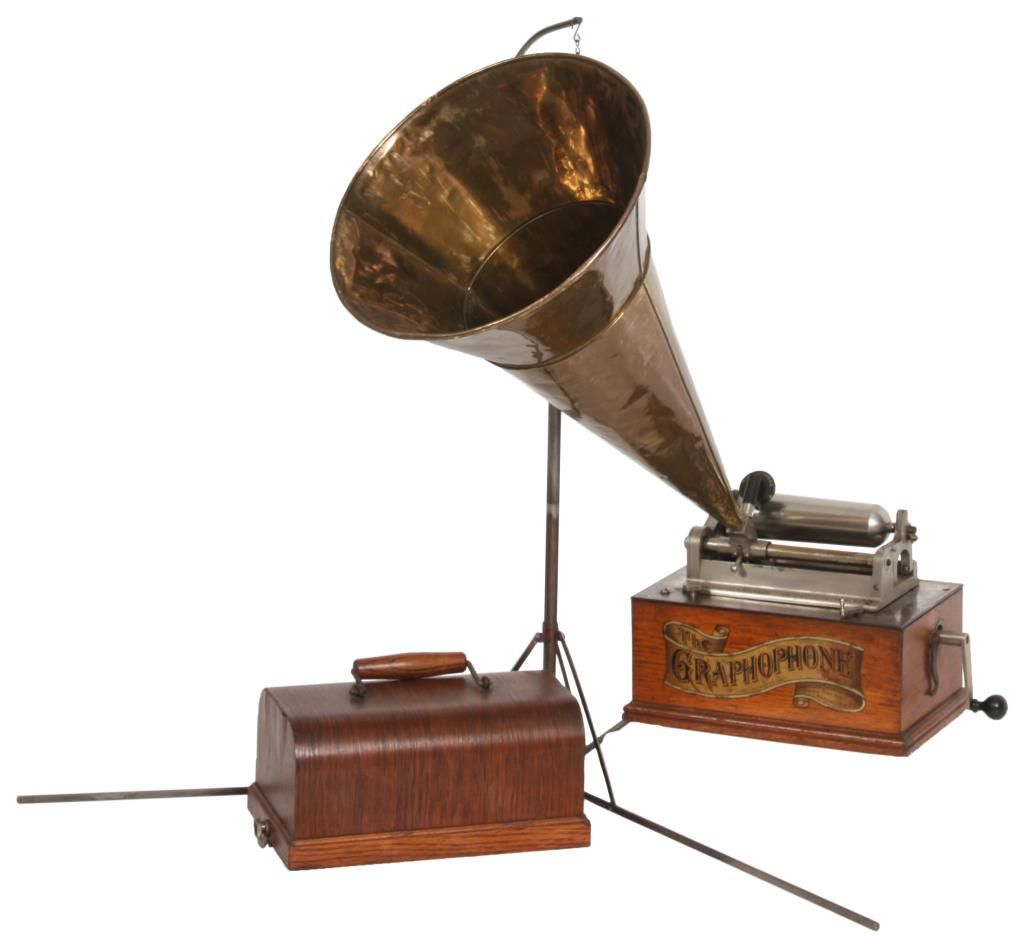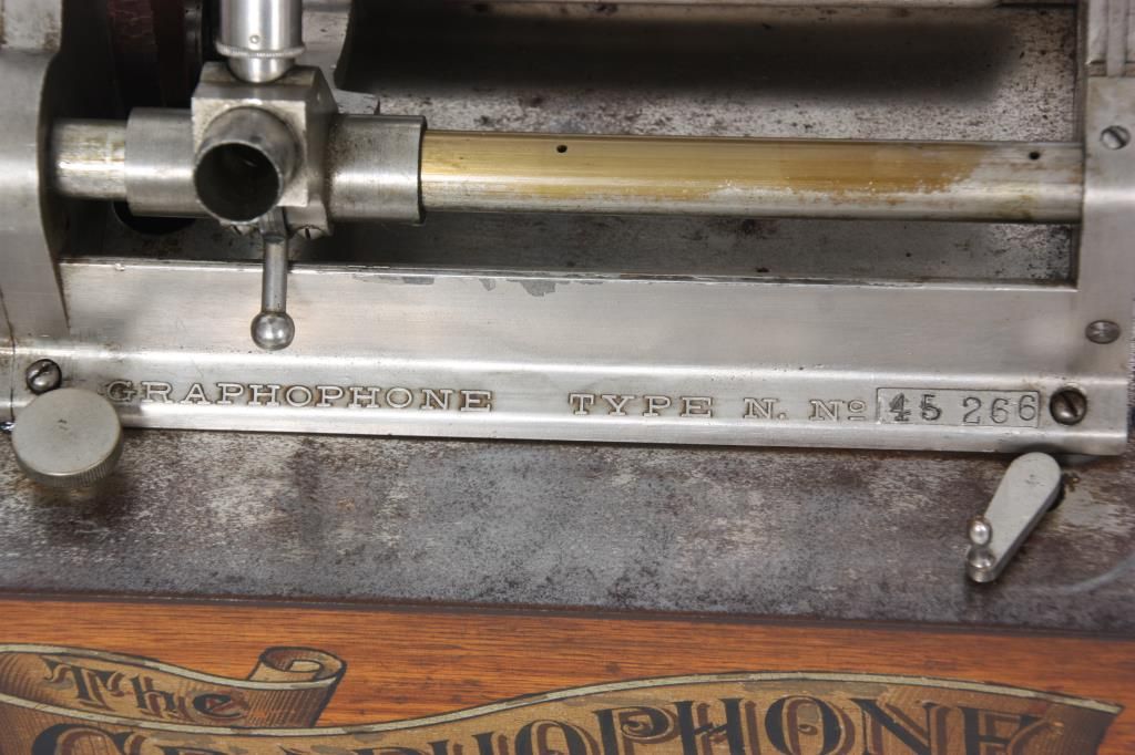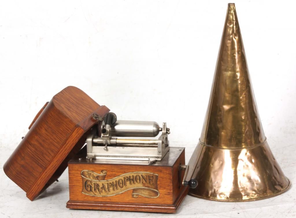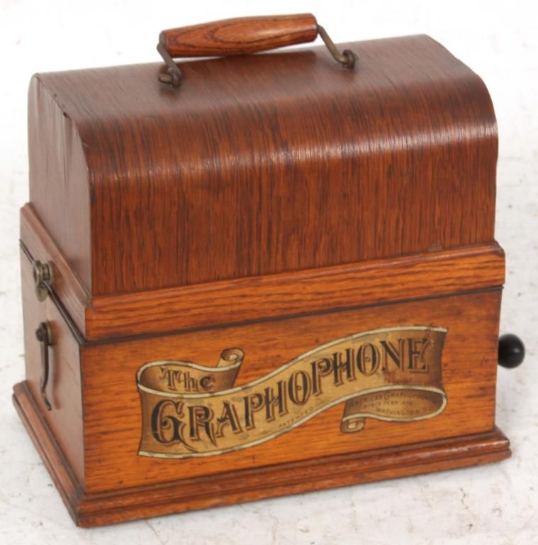 American Type N “Bijou” Cylinder Graphophone. Oak case American Graphophone banner decal on the front and a domed lid; nickel plated chassis and bedplate, stamped Graphophone Type N, No. 45366 and has a black gutta percha reproducer. Has a tripod crane with large brass horn (slightly dented), with waffle handle, measuring 20. in. long x 14 in. dia. This model was the first designed as a unit for home entertainment and the first to have a fixed mandrel with hinged endgate. Case measures 10.5 in. high x 11.5 in. wide x 7.25 in. deep.