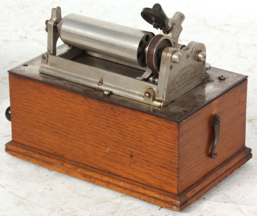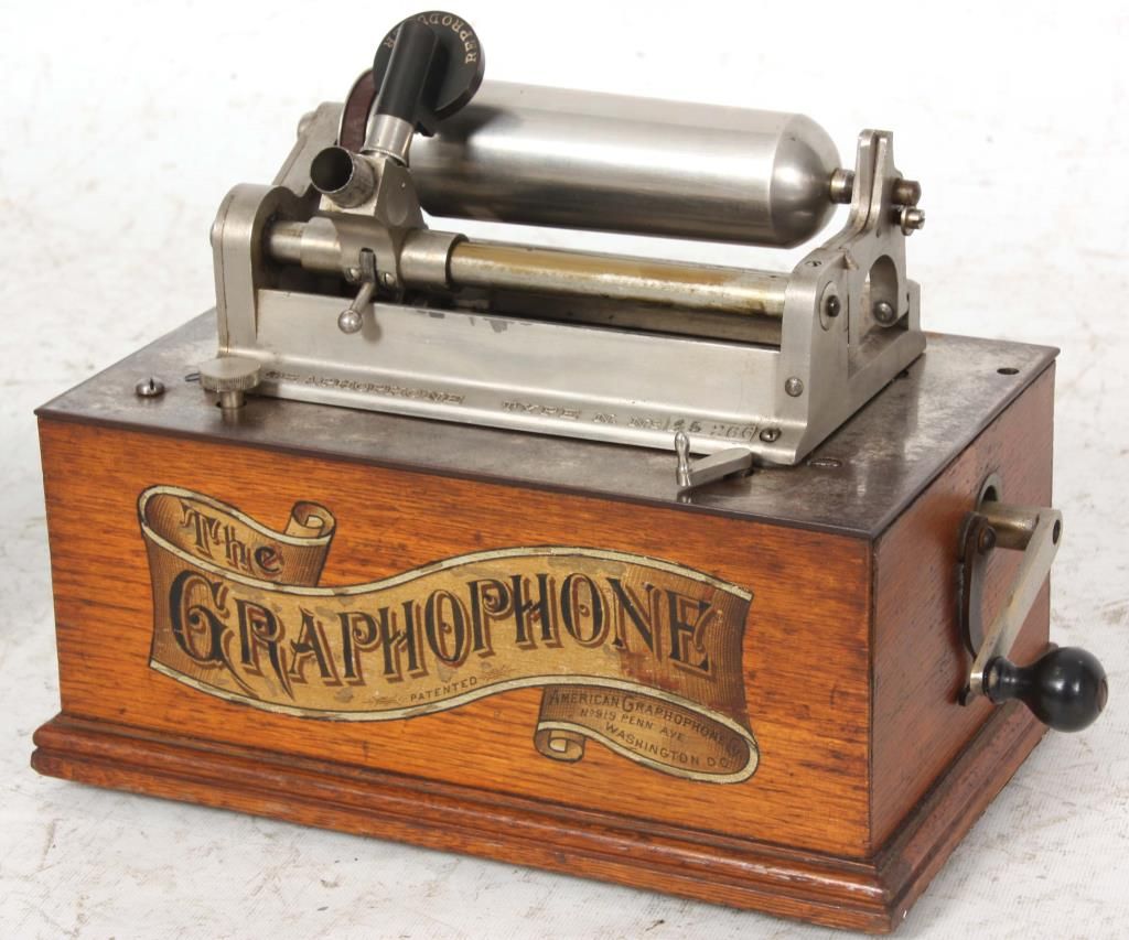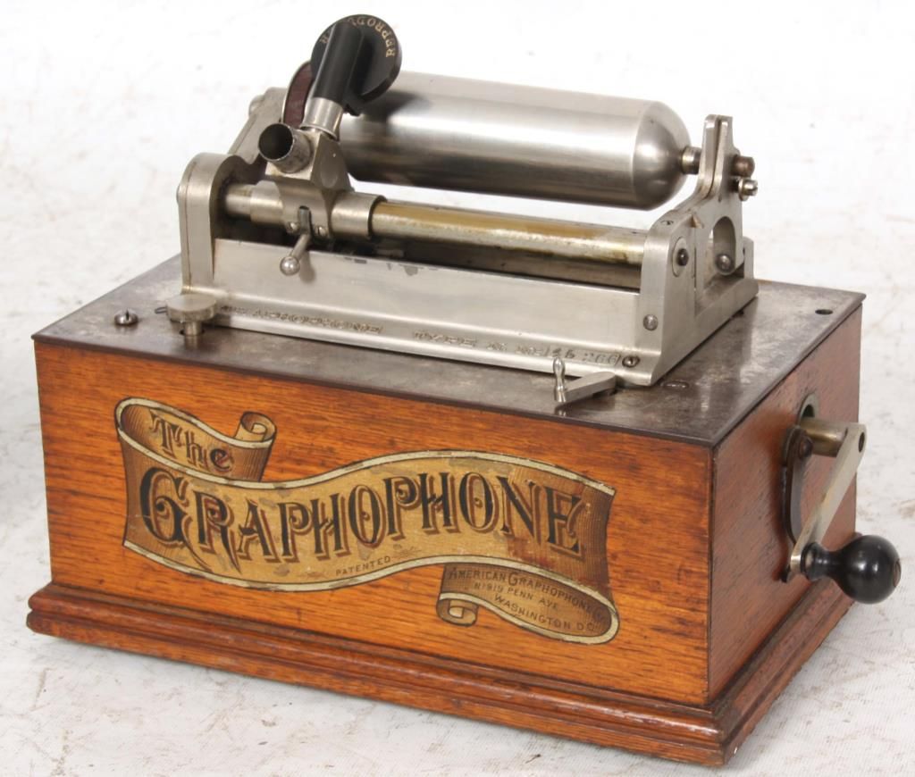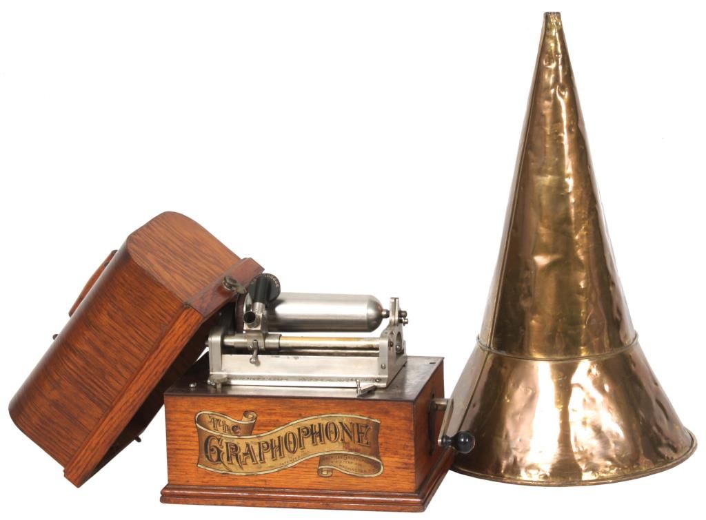 American Type N “Bijou” Cylinder Graphophone. Oak case American Graphophone banner decal on the front and a domed lid; nickel plated chassis and bedplate, stamped Graphophone Type N, No. 45366 and has a black gutta percha reproducer. Has a tripod crane with large brass horn (slightly dented), with waffle handle, measuring 20. in. long x 14 in. dia. This model was the first designed as a unit for home entertainment and the first to have a fixed mandrel with hinged endgate. Case measures 10.5 in. high x 11.5 in. wide x 7.25 in. deep.