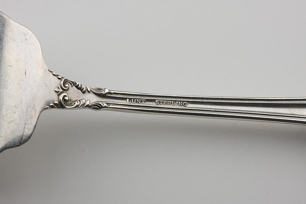 Vintage 8 Piece Sterling Silver Completer Serving Set ED1395 . Sterling silver "American Victorian" 8 piece completer serving set by Lunt. Set includes:1. Salad fork 8.25" 2. Salad spoon 7.25" 3. Master butter 6.75" 4. Jelly spoon 6" 5. Lemon fork 5" 6. Casserole spoon 8.75" 7. Cold meat fork 8. pickle fork 5.5".