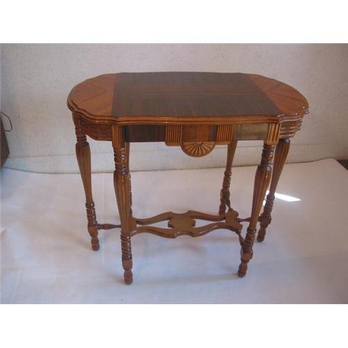 A late copy of a Victorian end table made of birch wood and mahogany. This piece is supported by long, slender legs.