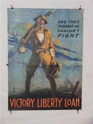 American WWI Poster, "And They Thought We Couldn't Fight Victory Liberty Loan", Artist-Clyde Forsythe, Printer-Ketterlinus Phila., 40" x 29 1/2", Condition – Poor/Fair: Folding and Compression Creases, Punctures, Border Tears, Soiling, Corner and Border Losses Restored w/ Inserted Replacement,