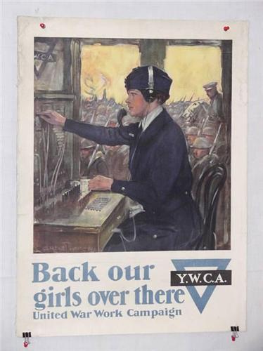 American WWI Poster, "Back Our Girls Over There (Y.W.C.A) etc.", Artist-Clarence F. Underwood, Printer-Not Provided, 28" x 21", Condition – Fair: Corner Tears and Soiling to Upper Left Corner, Scuffing; Linen Backed w/ Grommets,