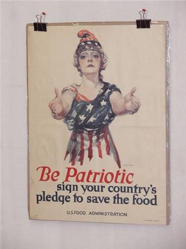 American WWI Poster, "Be Patriotic – Sign Your Country's Pledge to Save the Food (United States Food Administration)", Artist-Paul Stahr, Printer-The W.F. Powers Co. Litho-NY, 29" x 21", Condition – Good: Folding and Compression Creases, Border Tears (Up to 3"), Border Wrinkling,