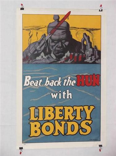 American WWI Poster, "Beat Back The Hun With Liberty Bonds", Artist-F. Strothmann, Printer-Not Provided, 30" x 20", Condition – Good: Creasing and Small Border Tear,