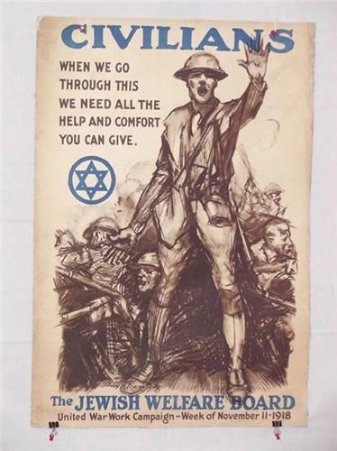 American WWI Poster, "Civilians etc. The Jewish Welfare Board etc.", Artist-Sidney H. Riesenberg, Printer-Not Provided, 31 1/2" x 21 3/4", Condition – Fair: Border Tearing, Corner Losses, Stained Edge; Linen Backed w/ Grommets;