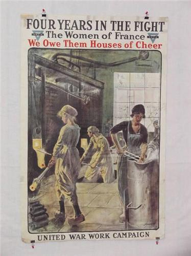 American WWI Poster, "Four Years in the Fight The Women of France etc. (YWCA)", Artist-L. Jonas, Printer-The Strobridge Litho. Co.-Cincinnati and New York, 42 1/4" x 27 3/4", Condition – Fair: Losses and Creasing on Corners, Border Tears and Staining Including Scotch Tape Staining; Linen Backed w/ Holes for Grommets,