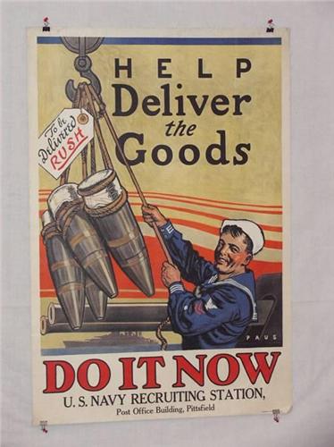 American WWI Poster, "Help Deliver the Goods Do It Now etc.", Artist-Paus, Printer-American Lithographic Co.-NY, 41" x 28", Condition – Good: Corner Creasing and Soiling; Linen Backed w/ Holes for Grommets,