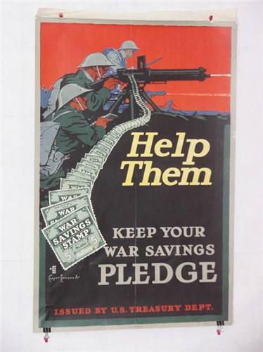 American WWI Poster, "Help Them Keep Your War Savings Pledge", Artist-Casper Emerson Jr., Printer-American Lithographic Co.-NY, 29 3/4" x 20", Condition – Good: Fold Creasing; Linen Backed w/ Grommets,