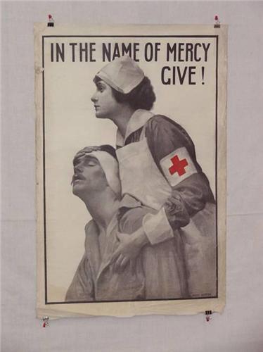 American WWI Poster, "In the Name of Mercy Give! (Red Cross)", Artist-Albert Herter, Printer-Not Provided, 36 1/2" x 24", Condition – Poor/Fair: Border Tears, Wrinkling and Staining, Lower Border Penetrating Stain (Approx. 5"); Linen Backed,
