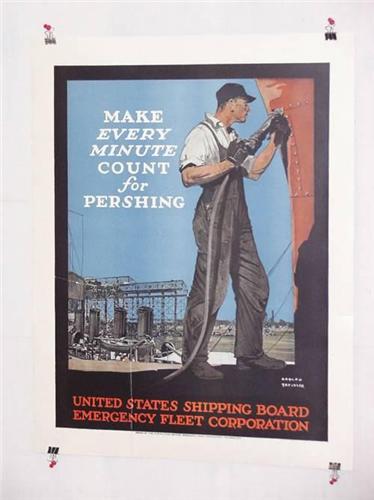 American WWI Poster, "Make Every Minute Count for Pershing (United States Shipping Board)", Artist-Adolph Treidler, Printer-The Publications Section, Emergency Fleet Corporation-Philadelphia, 28 1/4" x 22", Condition – Poor/Fair: Deep Penetrating Tear (Up to 9"), Other Border Tears, Creasing,