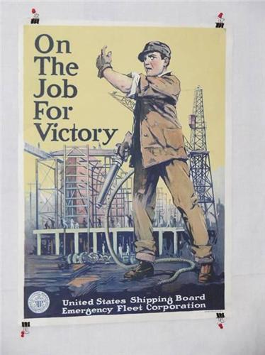 American WWI Poster, "On The Job For Victory (United States Shipping Board) etc.", Artist-Not Provided, Printer-Alpha Litho. Co. Inc.-NY, 27 3/4" x 20 3/4", Condition – Fair: 4 1/2" Penetrating Tear to Left Side, Other Border Tearing, Corner Creasing, Soiling,