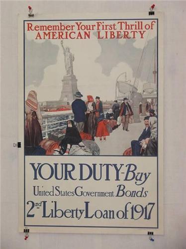 American WWI Poster, "Remember Your First Thrill of American Liberty – Your Duty – Buy United States Government Bonds – 2nd Liberty Loan of 1917", Artist-Not Provided, Printer-Sackett and Wilhelms Corp.-NY, 30" x 20", Condition – Good: Border Tears, Folding Creases,
