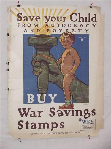 American WWI Poster, "Save Your Child From Autocracy and Poverty Buy War Savings Stamps etc.", Artist-Herbert Paus, Printer-The United Stated Printing and Lithographic Co.-New York, 40 1/4" x 30", Condition – Poor/Fair: Deep Penetrating Tears (Up to 10"), Corner and Border Losses, Staining, Creasing, Punctures,