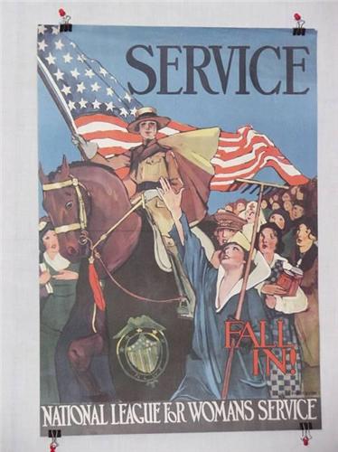 American WWI Poster, "Service Fall In! National League for Womans Service", Artist-Lucile Patterson, Printer-Not Provided, 24 3/4" x 17 1/2", Condition – Good: Some Creasing, Stain to Upper Right Corner; Linen Backed,