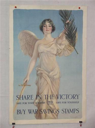 American WWI Poster, "Share in the Victory etc. Buy War Savings Stamps", Artist-Haskell Coffin, Printer-Mural Advertising-Rusling Wood, 30" x 20", Condition – Good: Modest Border Tearing and Corner Creasing; Linen Backed w/ Grommets,