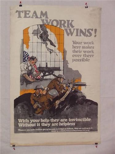 American WWI Poster, "Teamwork Wins! Your Work Here Makes Their Work Over There Possible etc.", Artist-Roy Hull Still, Printer-John H. Eggers Co. Inc.-New York, 41 3/4" x 27 1/2", Condition – Fair: Deep 13" Penetrating Tear (Stabilized), Creased Corners, Some Staining and Soiling; Linen Backed,