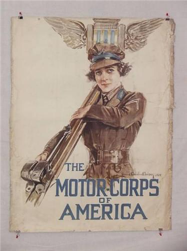 American WWI Poster, "The Motor-Corps of America", Artist-Howard Chandler Christy-1918, Printer-Not Provided, 41" x 32", Condition – Fair: Border Losses, Peeling and Staining, Creasing and Scuffing, Some Border Tears; Linen Backed w/ Holes for Grommets,