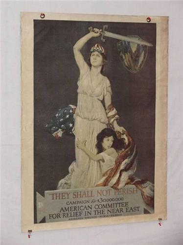 American WWI Poster, "They Shall Not Perish – Campaign for $30,000,000 etc.", Artist-Douglas Volk-1918, Printer-American Lithographic Co.-NY, 40" x 30", Condition – Good: Small Border Tears, Staining on Right Border; Linen Backed w/ Grommets,