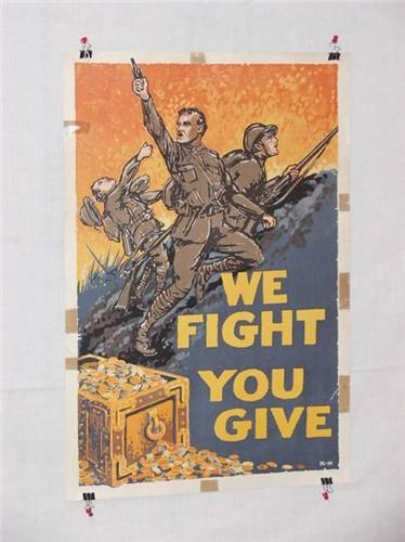 American WWI Poster, "We Fight You Give", Artist-K- N, Printer-Not Provided, 28" x 19", Condition – Poor/Fair: Scotch Tape Stains and Border Tears, Small Border Loss to Upper Left,