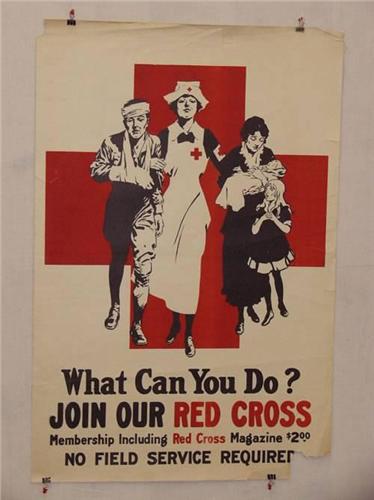 American WWI Poster, "What Can You Do? Join Our Red Cross etc.", Artist-Not Provided, Printer-Not Provided, 42" x 28", Condition – Poor/Fair: Corner Losses to Lower Right and Upper Left Corners, Fold Creasing, Border Tears, Staining,