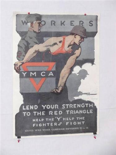 American WWI Poster, "Workers Lend Your Strength etc. (YMCA)", Artist-Gil Spear, Printer-Not Provided, 27 1/4" x 19 3/4", Condition – Good: Some Creasing; Linen Backed w/ Grommets,