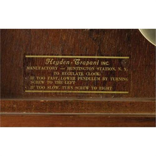 <B>An American Walnut Case Clock<BR></B></I>Hayden-Trapani, Inc., New York<BR>Twentieth Century<BR>The clock face with roman numerals for hours, arabic numerals to the outer edge, glass face cover hinges open as does the lower glass case to reveal the pendulum<BR>Sticker to the inside of the lower case<BR>34 inches high x 17 inches wide<BR><BR><b>Shipping:</b> Requires 3rd Party Shipping (<a target="_blank" href="http://www.heritageauctions.com/common/shipping.php">view shipping information</a>)