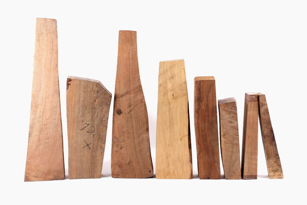 For your consideration is a set of eight walnut and maple rifle stock and grip blanks. In this lot there are three walnut rifle stock blanks, one maple stock blank, and four walnut grip blanks. The walnut pieces show a beautiful wood texture and wonderful shape to be formed into a rifle stock or grip. These walnut blanks show excellent natural color, figure and grain. These pieces show a straight grain, and some with a wavy grain, giving these blanks a opportunity to be turned into a beautiful and unique rifle stock or grip. The one maple stock blank shows a wonderful texture also with a slightly wavy grain with a mostly light color and dark color section giving nice contrast. The maple piece measures approximately 21"" x 3"W x 4 3/8" at the front x 6 3/4 at the butt. The walnut stock blanks measure approixmately 1) 26" L x 2 1/2"W x 3" at the front x 7 1/2" at the butt 2) 18" x 2 3/4" x 5 3/4" x 8" 3) 28" x 2 3/4" x 3 1/2" x 7". The walnut grip blanks measure approximately 1) 18"L x 3" x 4 1/4" 2) 14 1/2"L x 3" x 3 1/4" 3) 15 1/2"L x 2 3/8" x 2 1/2" x 1" 4) 15 1/4"L x 2 3/4" x 2"