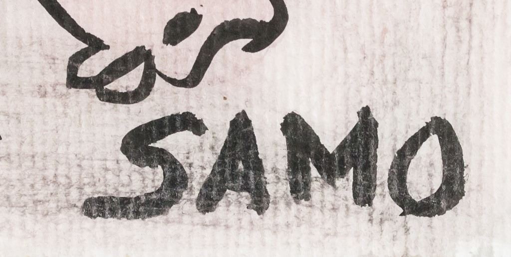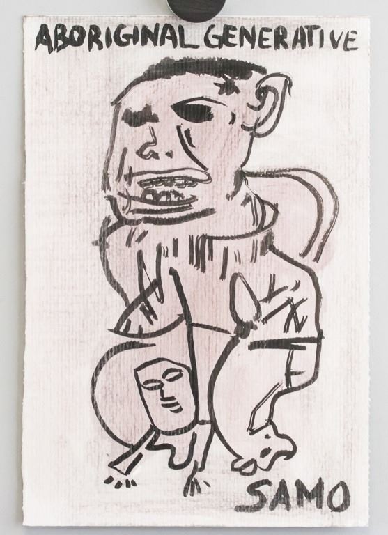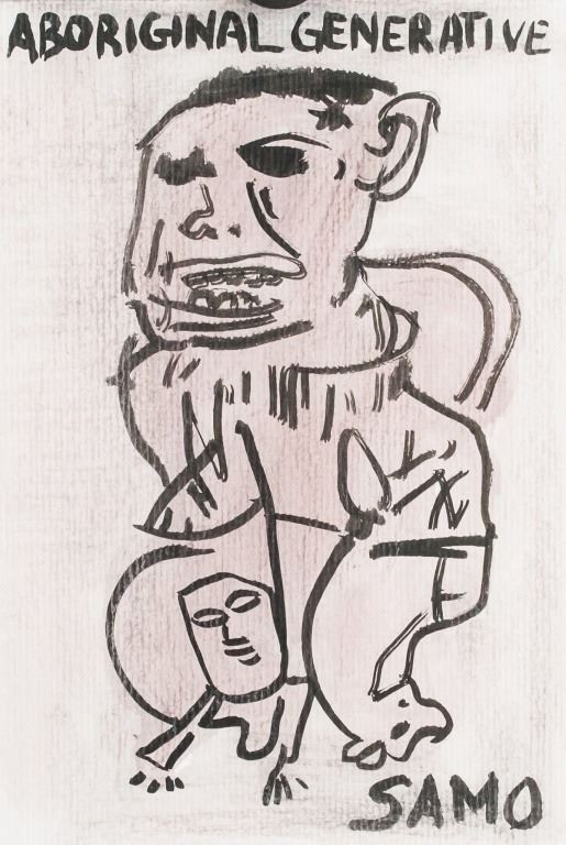 Watercolor on paper. Featuring a portrait of a figure. Inscribed ABORIGINAL GENERATIVE on top and inscribed SAMO on the lower right corner. Inscribed JMB and outlined like a postcard on verso. 21 x 14 cm (8.25 x 5.75 inches)