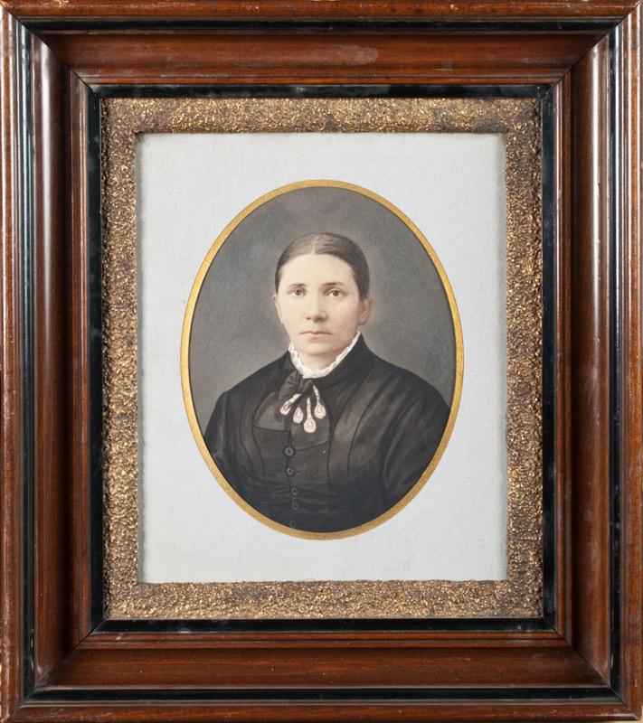 Painted to depict a portrait of a lady in period dress with fine details, probably circa 1860's. Mounted in its' original deep dish mahogany frame with textured gilt liner. 9" H x 7" W (sight), 18" H x 16" W (framed).