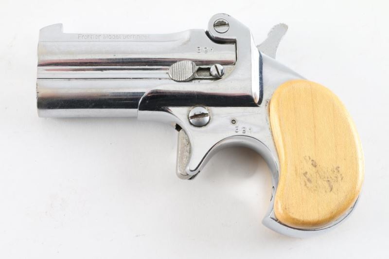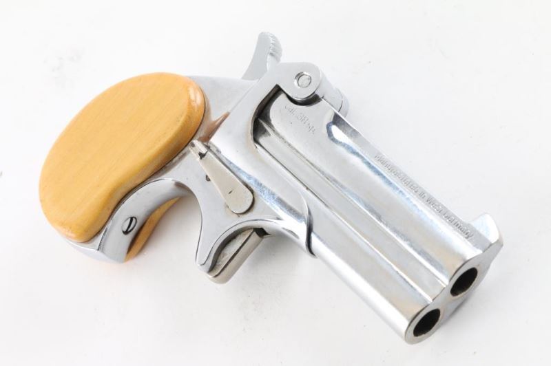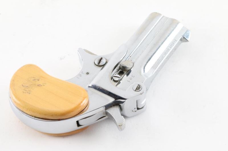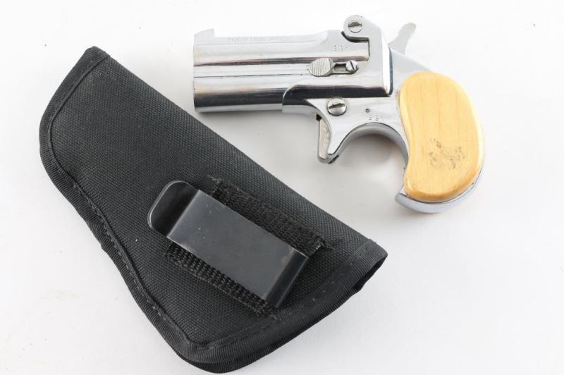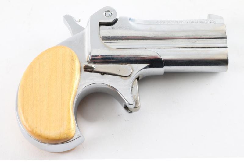 SN: 391 West German made over/under derringer imported by American Weapons Corporation, Burbank CA. 38 Special. Features chrome plated finish, smooth wood grips, 3" barrel, fixed sights, spur trigger, manual extraction button, right side lever to open. Bores are very good. Plating is very good with few signs of peeling or flaking. Grips are very good, some sticky tape residue on left panel should clean off easily. Numbers on barrel match frame. Includes good condition over sized black nylon inside-the-waistband clip holster with elastic side pouch for two cartridges. Condition is NRA Excellent *** C&R Firearm ***