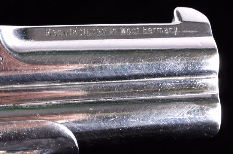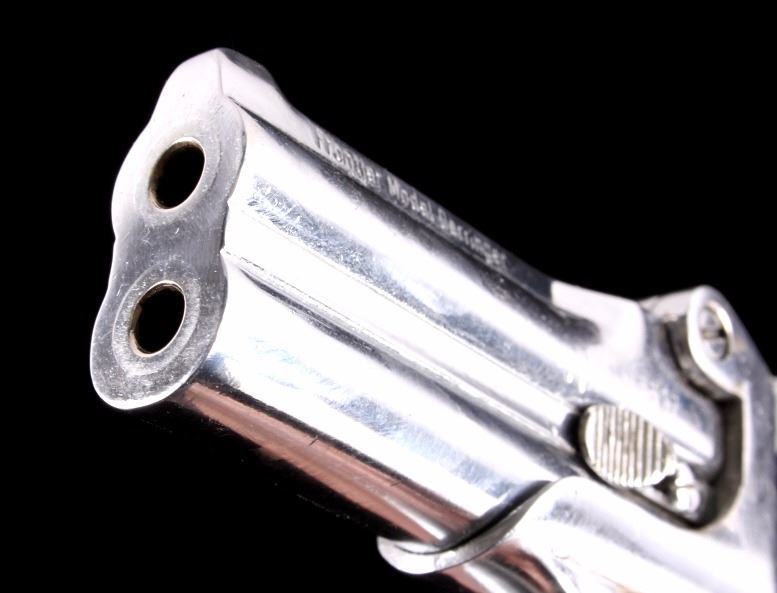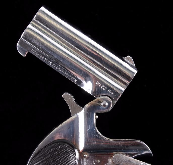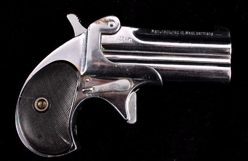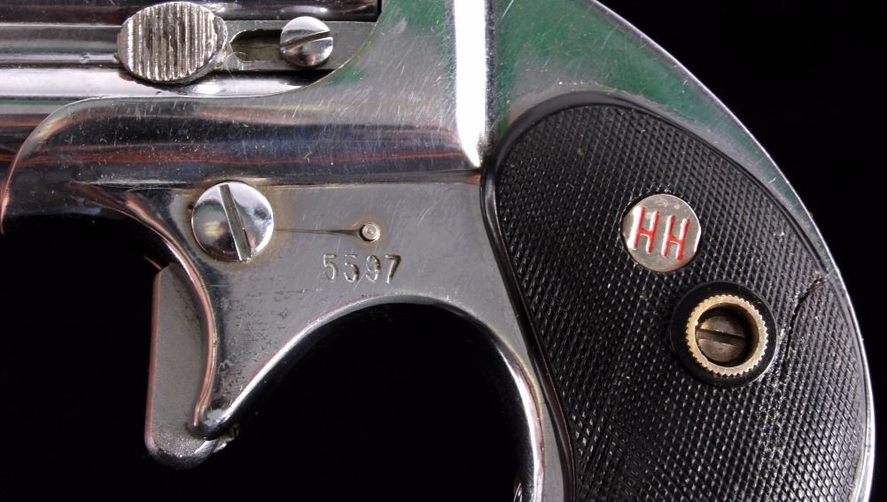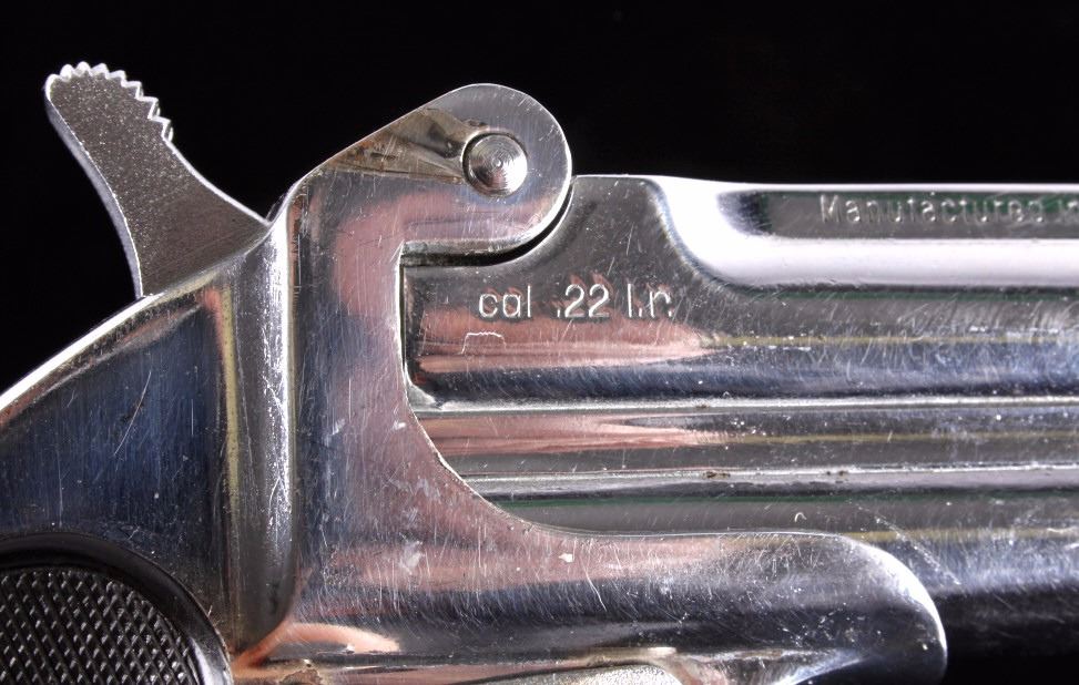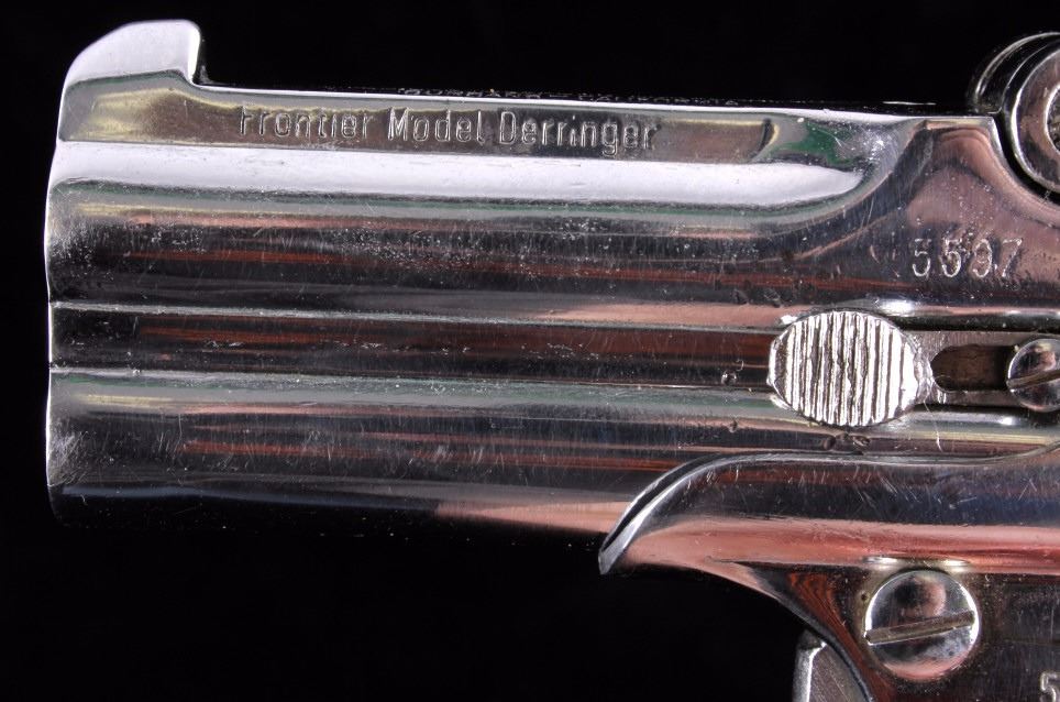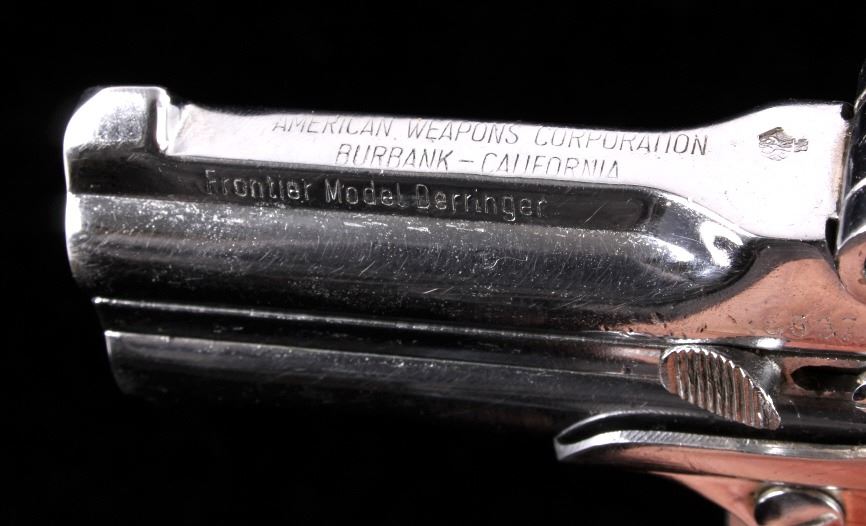 This is an American Weapons Corporation Frontier Model Derringer .22 pistol. The pistol features a nickel finish and fires a .22 long rifle cartridge. The pistol also has checkered grips marked "HH". The pistol is in good condition. It measures 3.25" x 5".