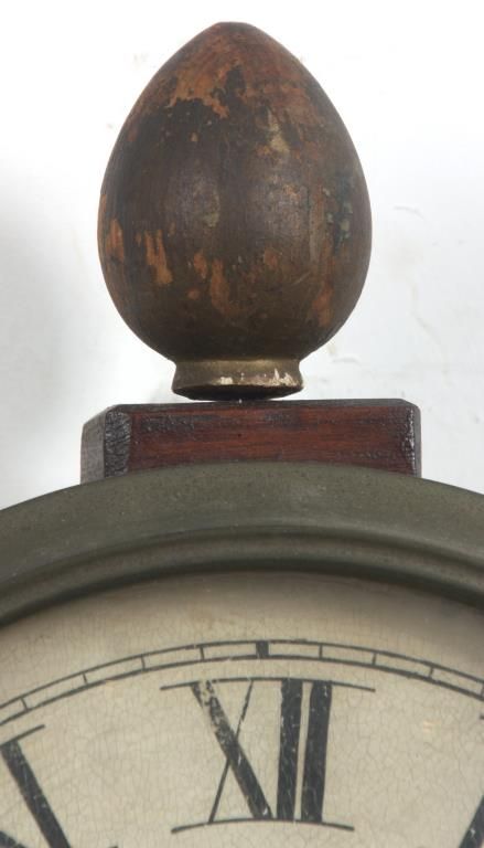 American Weight Driven Banjo Clock. Original 8 in. painted metal dial has black Roman hour numerals and black hands; typical brass weight driven time only 8 day movement has a steel pendulum rod and brass covered bob, brass pulley with lead weight. Mahogany banjo style case has brass door bezel with convex glass, pierced brass side arms, reverse painted throat glass and reverse painted lower tablet with Apollo scene; rope twisted carving around the lower door & throat frame and turned acorn finial on top. Gilt finish is worn from the finial, door & throat framework, throat is glued in place, lower tablet is an old replacement, dial has some flaking & paint loss with some inpainting, the case is refinished and the side arms are not attached. 31 in. high x 10 in. wide x 4 in. deep.