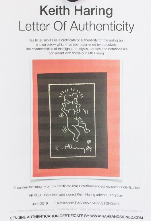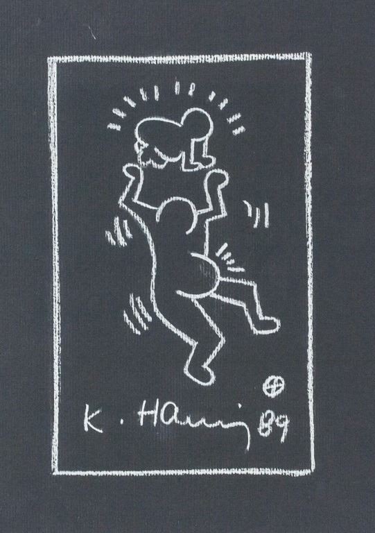 White chalk on black paper. Featuring pregnant outline figure with a baby above her head. Signed "K. Haring" beneath the figure. "89" inscribed beside the signature. Label on verso reads "KEITH HARING 1989 WHITE pencil on paper Courtesy of the artist No. 124 Keith Haring Exhibition AMSTERDAM". Stamped illegibly on verso. Accompanied with Letter of Authenticity. 24 x 17.2 cm (9.5 x 6.75 in).