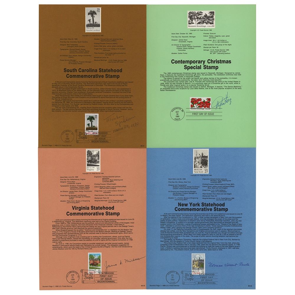 Four 8 x 10.5 philatelic souvenir stamp sheets, each signed in ink by a noted American writer. Signers are: Stephen King, James A. Michener, Norman Vincent Peale, and Mickey Spillane. In overall fine condition.
