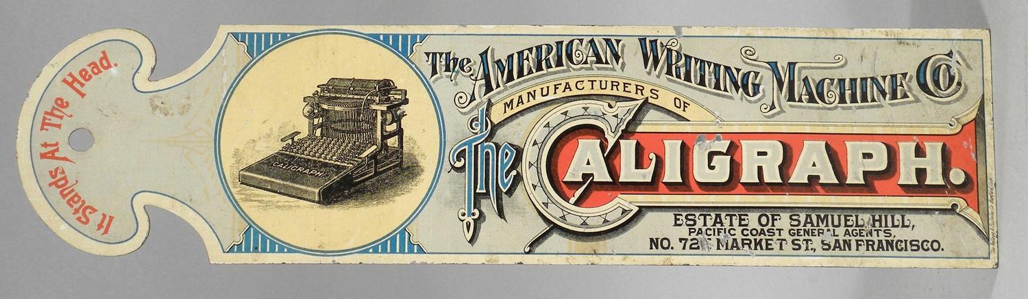 The American Writing Machine Co. Die Cut Tin Page Turner. Mfg. of "The Claigraph." Estate of Samuel Hill. Pacific Coast General Agents, San Francisco. Small dent, wrinkles and some minor scratches otherwise good condition.12 1/4 X 3 inches. Start Price $30