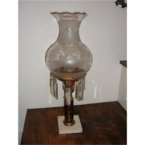 An astral lamp of gilt and bronze with painted brass and a white marble base. The base measures