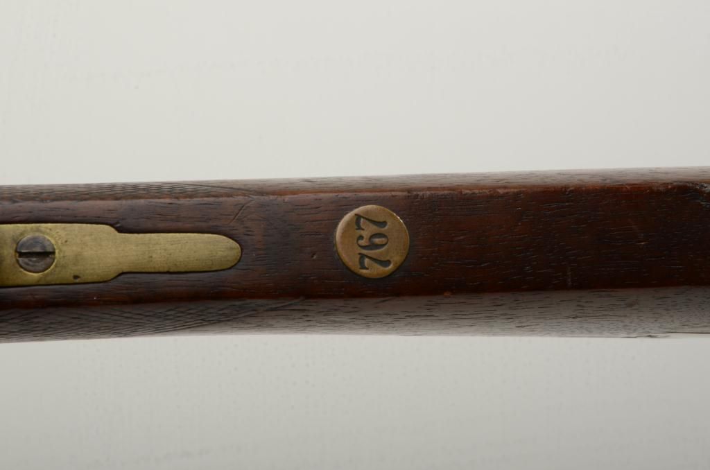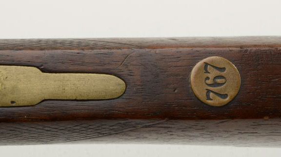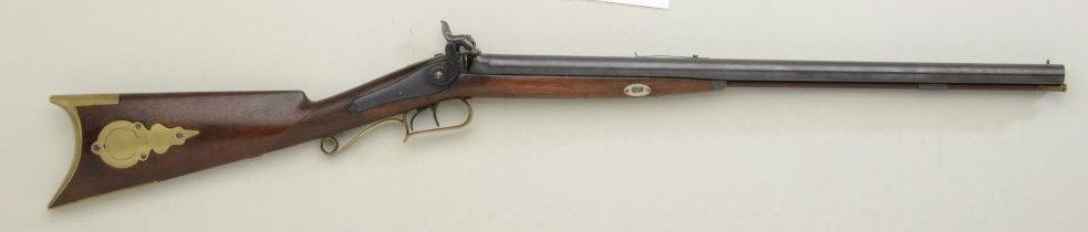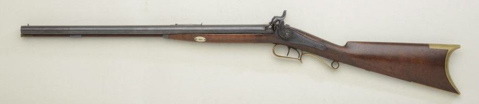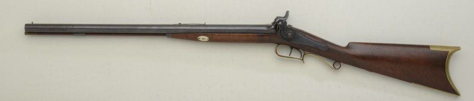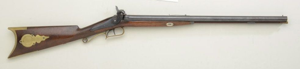 American double barrel percussion rifle marked "H. F. Palmer, Adrian, Michigan", circa about 1850, with brass museum tag attached to belly of stock, numbered 767, formerly in Michigan Historical Societycollection. The rifle shows .36 cal. medium weight barrels that have been reduced to 22-1/8", 38-1/2" overall; showing back action locks and plain brass mounts with double triggers. The rifle shows and old re-bluedfinish with some pitting and erosion, stocks are good to very good with just normal wear. There is a brass patch box on the right side of stock. The rifle was reduced in size and would be perfect as a "buggy" gun. American double rifles are scarce and seldom encountered. The action is good, bore is good. Est.: $1,250-$2,500