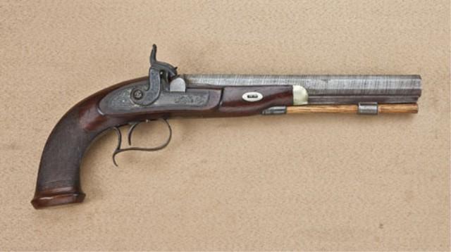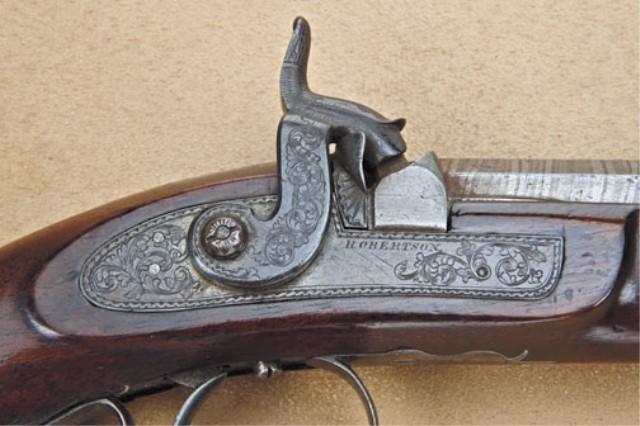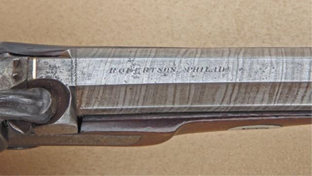 American dueling pistol signed Robertson, Phila. on barrel and Robertson on lock. Approx. .50 caliber smoothbore. Medium to slightly heavy weight 9-1/2” octagon barrel, 15” overall, half stocked with checkered wrist, German silver trim, engraved iron trigger guard, with nicely engraved lock and furniture. Gold band a breech. The pistol is equipped with an adjustable set trigger and the pistol remains in good condition showing considerable original brown striping on the barrel. Some dings in the area of the signature, but crisp edges and at least very good. The lock shows all its original parts and has drifted to a grayish brown patina with traces of case hardening. The stock is good to very good with just some minor storage marks from carry and use. The action is good and the pistol is good overall. Robertson was a very well known maker who was well recognized for this style pistol. Equipped with a period oak ramrod. From the William R. Orbelo Collection. Est: $2,000 - $4,000