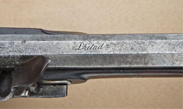 American flintlock Kentucky/Dueling pistol with English import lock by Sharp, barrel signed Philada (Philadelphia), circa approx. 1810-30. The pistol measures 16” overall, 9-7/8” barrel, of approx. .50 caliber rifled with 10” medium weight barrel, 16” overall. Plain walnut stock with brass mounts and simple American styling. The pistol remains in good condition showing a grey to brown patina finish, light to moderate pitting and erosion and some slightly heavier pitting around firing areas. The lock is original and retains its correct small parts. The stock shows some repair at the forend and some darkening in that area, otherwise is good. The mounts are plain other than the triggerguard shows some light engraving and pineapple type finial. There is a silver plaque inlaid at the wrist. There is some opening around the pinholes and some scratches in the original varnish, some small losses at the area of the lock behind the hammer and darkening extends backward about 4”. The rear portion of the wood is at least good. An original to the period wood ramrod is retained. An interesting pistol that could be described as a Kentucky or dueling pistol as it has elements of both styles. From the William R.