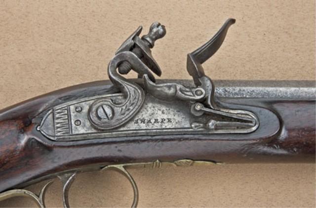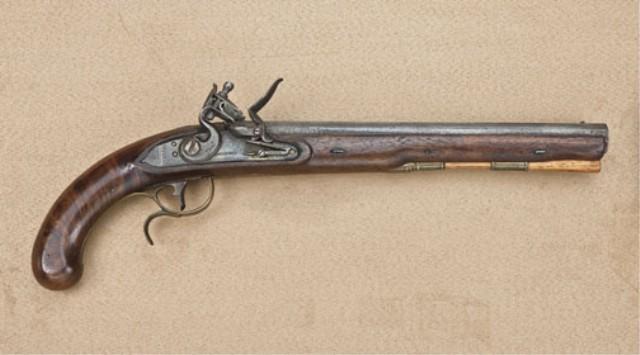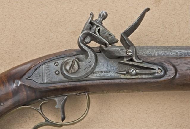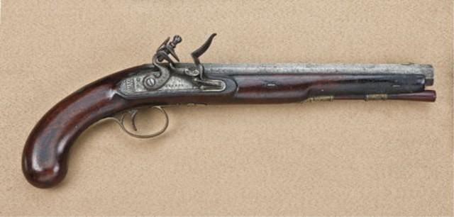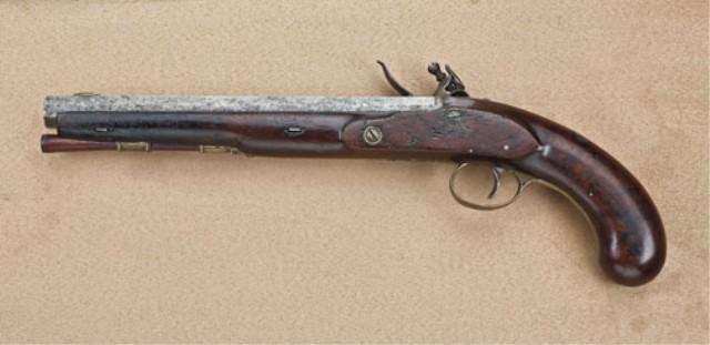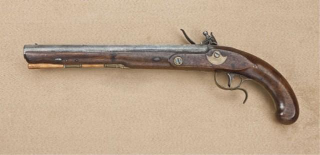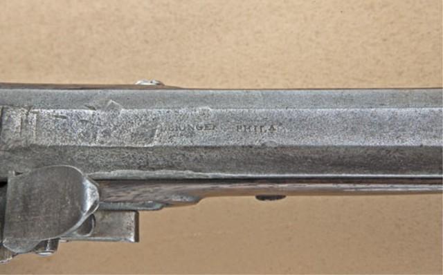 American flintlock dueling pistol by Henry Deringer, Philadelphia. .54 caliber smoothbore, 11-3/8 medium to heavy weight octagon barrel 17-1/4" overall. Full stocked to muzzle in American walnut with some nice striping at wrist." The pistol shows a brass spurred guard and plain brass mountings with engraved pineapple finial at top of trigger guard. Both the lock and barrel are stamped H. Deringer" and the barrel is marked "Phila". The condition is fair to good the metal" surfaces show light to slightly heavy scattered pitting and erosion. The heavier pitting is at the breech and firing areas. The pistol is in its original flintlock configuration with period replaced frizzen and frizzen spring. The frizzen and spring are a period repair in our opinion. The stock is good with replacements of wood at the top front of forend on each side, extending back 3-1/2 from the muzzle by approx 1/4"otherwise wood is good with some light refreshing. The"
