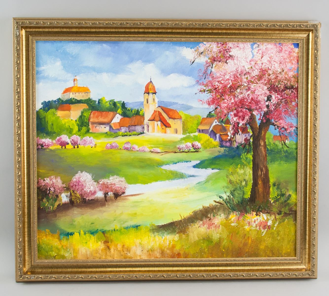 Oil on panel, framed. Featuring a landscape scene. Canadian or American School. 48 x 58 cm (18.9 x 22.8 inches). Framed size: 60 x 70 cm (23.6 x 27.6 inches)