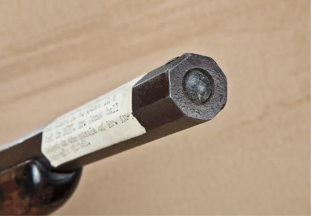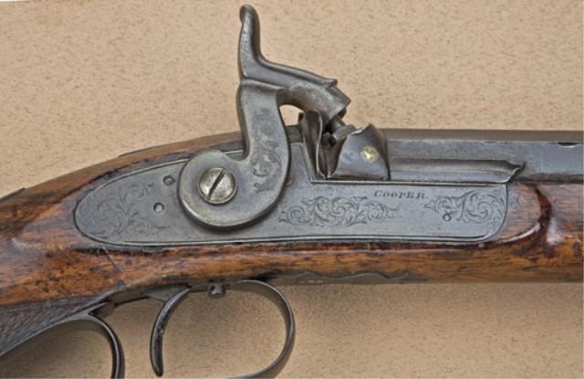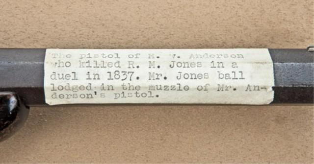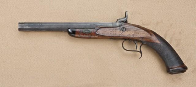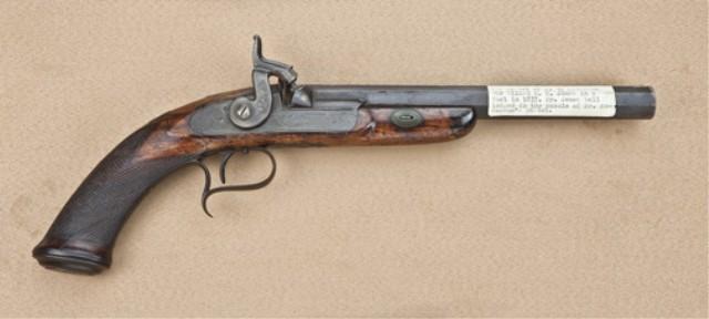 American percussion dueler/target pistol by Cooper of New York. Approx. 45 caliber smoothbore. 9-5/8” slightly heavyweight barrel, 16-3/8” overall, half stocked, engraved lock and iron mounts, double-gold banded at breech, in fair to good original condition. Old typed tag stuck on right side of barrel reads, “The Pistol of H. W. Anderson who killed R. M. Jones in a duel in 1837. Mr. Jones’ ball lodged in the muzzle of Mr. Anderson’s pistol.” This pistol shows the ball still lodged in the muzzle and was probably kept by Anderson as a keepsake. The pistol shows a dark-brown patina finish. Interestingly there is a dent on the right side of the muzzle, possibly from being dropped during the duel, and some dings along the edge. The stock is fair to good with some normal wear. There is a large loss of wood on left side of stock above barrel key. A sliver of wood approx. 1/4” by 3” long is missing, and shows being dropped. It is our theory the pistol was dropped when Jones’ ball hit the barrel. This gun could be in a museum as it is incredibly interesting. From the William R. Orbelo Collection. Est: $1,500 - $3,000