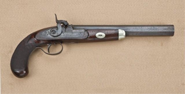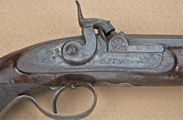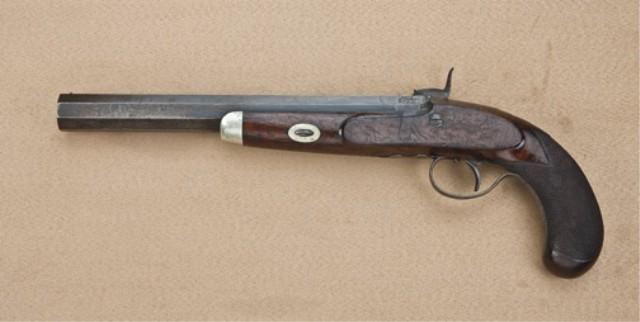 American percussion dueling/target pistol by H. F. Stronecker..52 caliber smoothbore, 10-1/8” heavy octagon barrel measuring 1” across the flats of the muzzle. 15-1/2” overall. Half stocked with plain walnut stock, nicely checkered at grip, rounded iron guard with set trigger. Lightly scroll engraved lock, bolster, and tang. The barrel shows a light patina finish, some light to moderate erosion and pitting. The edges of the barrel show some marks, the edges have gone to brown with light case hardening. The stock is good with many small scratches, some dings, mars, normal use, fairly sharp checkering and good overall. The action is good. A very big pistol that shows a German silver barrel key, escutcheons, and forend cap. From the William R. Orbelo Collection. Est: $1,500 - $3,000