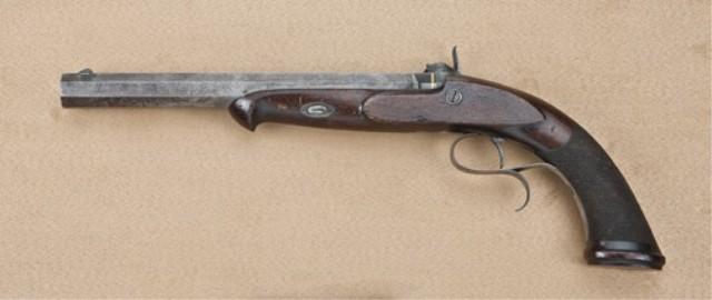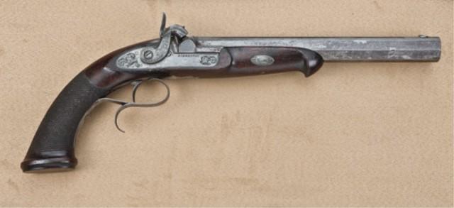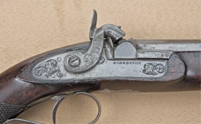 American percussion dueling/target pistol by Robertson. .45 caliber smoothbore. 10” heavy barrel, half stocked, engraved lock and mounts, iron triggerguard with spur, concealed single-set trigger, single gold band at breech. The pistol remains in good to very good condition showing a grey to brown patina finish, traces of silvery grey patina on lock, some scattered light to moderate erosion and pinprick pitting. The plain walnut stock is good to very good with checkering at the wrist, some minor scars, mars, scratching, and normal use. The action is crisp, the pistol is good overall. From the William R. Orbelo Collection. Est: $1,500 - $3,000