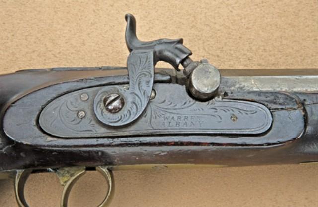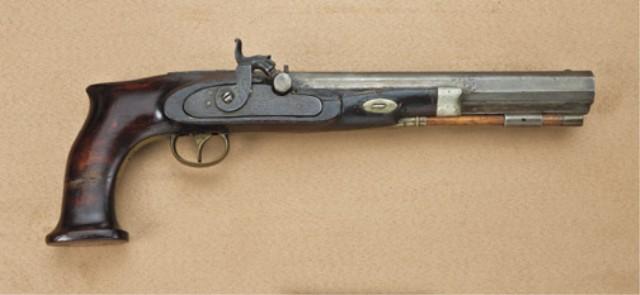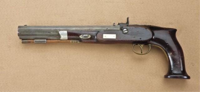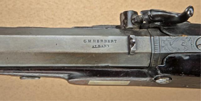 American percussion dueling/target pistol stamped “C. H. Herbert, Albany” on barren and “Warren Albany” on lock. Approx. .45 caliber smooth bore, 8-1/2” barrel, approx. 14-1/2” overall. Stocked in a reddish colored wood. The shape of the stock is a semi saw-handle, and very American in its appearance. The metal surfaces show a brown patina finish. Some just beginning erosion and pinprick pitting. There is some dings or mars on each side of the barrel from being grasped in a vice. The stock is fair showing breaks and repairs that are not well done, and an over coating of varnish when repaired. There is a gap between the lock and the stock. Small losses of wood around the drum. The action is working, fair to good overall. From William R. Orbelo Collection. Est: $1,000 - $2,000