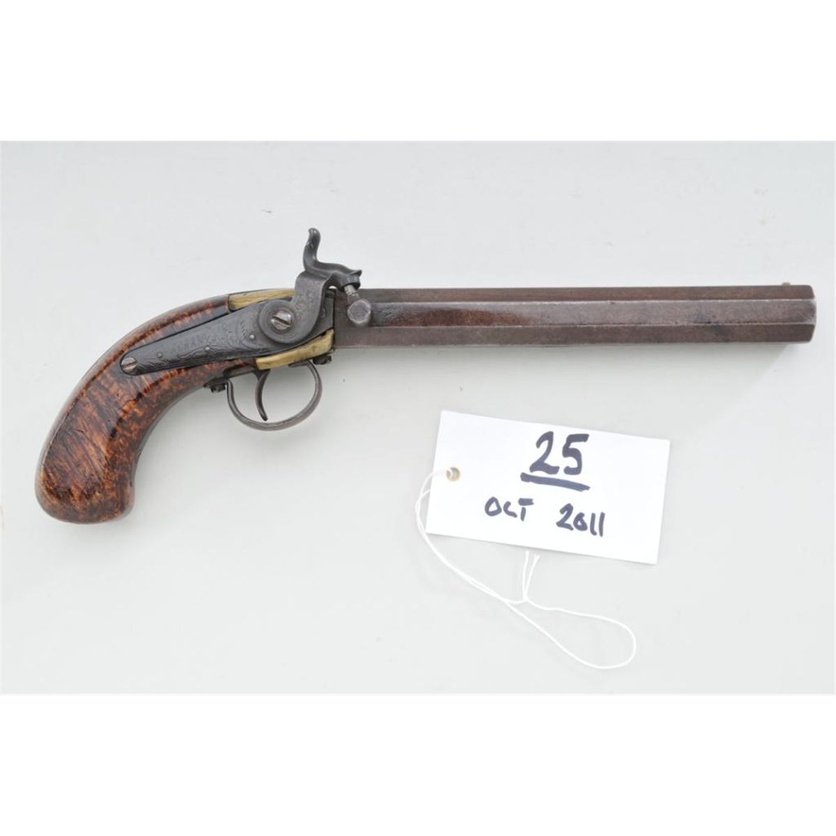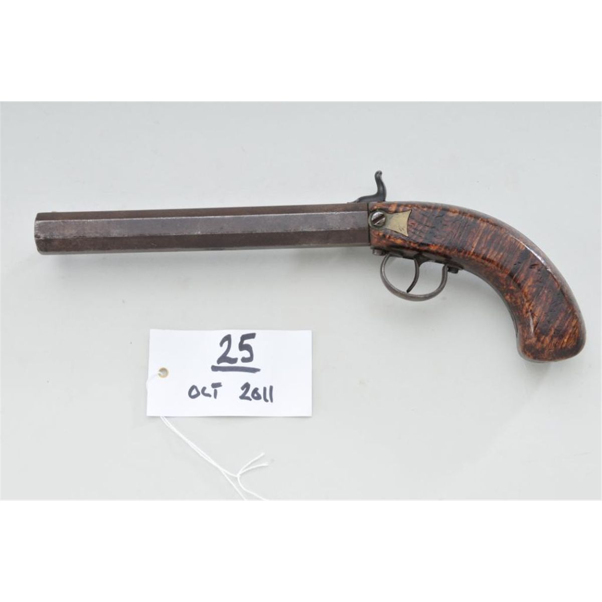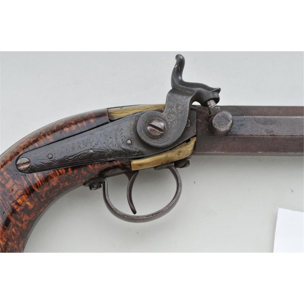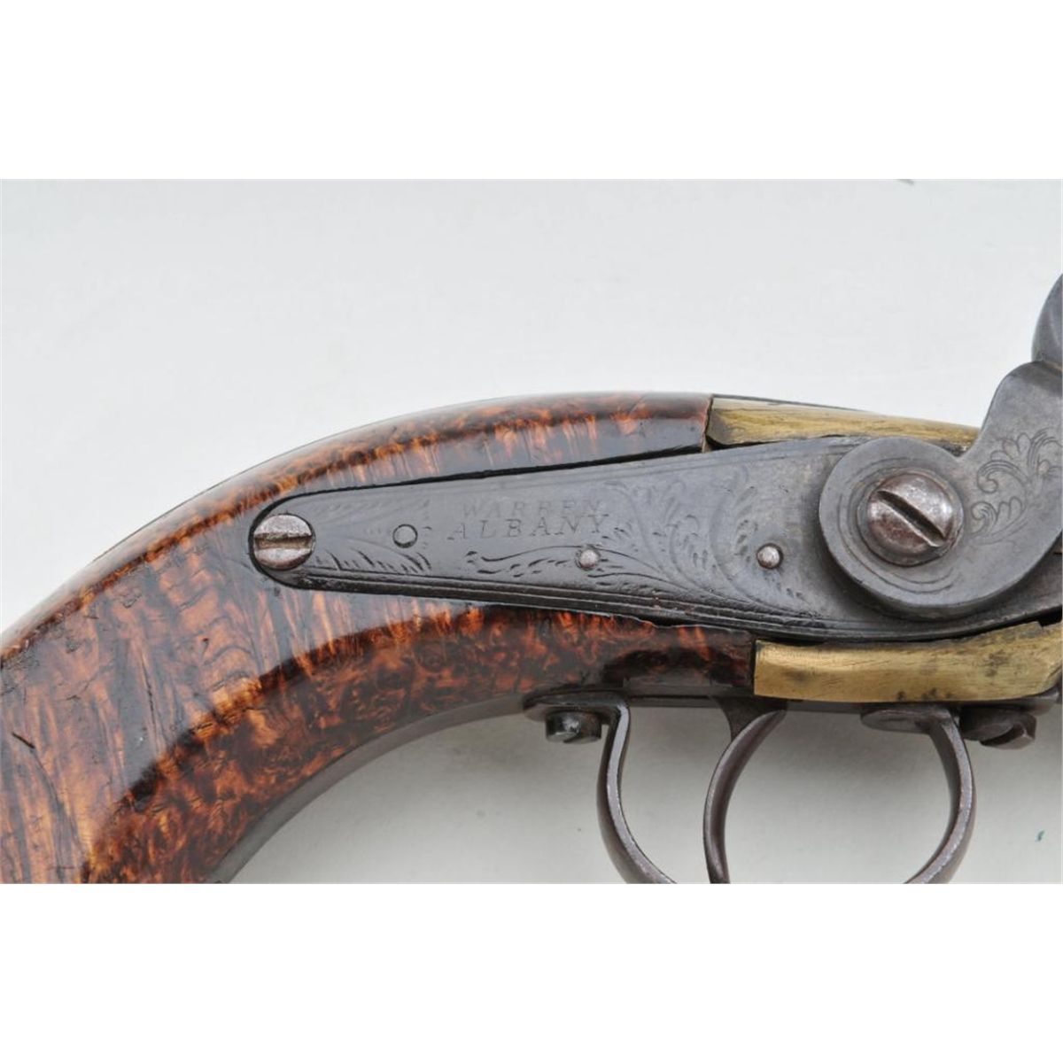 American percussion single shot pistol, circa approx. 1850’s to 60’s, lock marked Warren Albany, with original metal shoulder stock. The pistol measures 13-1/4” overall with 7-3/4” heavy octagon barrel of approx. .44caliber six-groove rifling. The pistol is stocked in flame and birdseye maple with a dark stain and shows a reinforced backstrap with two drill holes for wire type shoulder stock. There is a small German silver inlayin the butt in floral style, the triggerguard is iron, the lock escutcheon is brass. There is a brass firing plate at the top edge of the stock and bottom of lock. The metal surfaces show a brown patina finish with some scattered erosion, normal aging. Edges are sharp, markings good. Stock is very good with 60% varnish, wear at the edges, normal aging. Est: $800 - $1,600