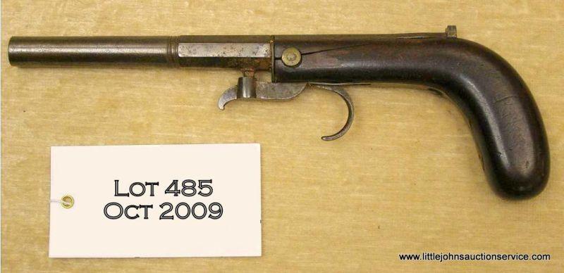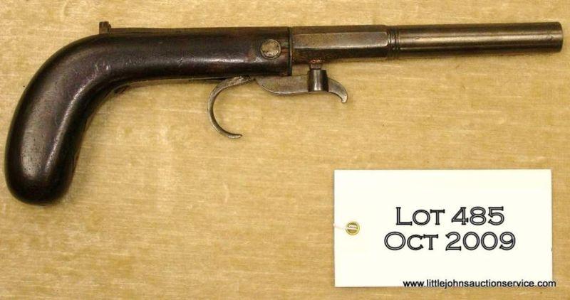 American percussion under-hammer "boot pistol" circa 1840's and unsigned. Approx. 10 1/2" overall with 5" barrel and about 31 cal. rifled good wood with 1 long crack. Typical New England style and just the type pioneers and 49ers likedto carry in sashes and boots. Est. $300 - $600