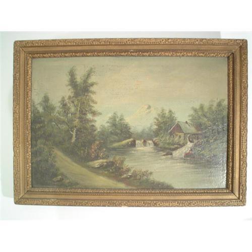 American School (19th.c.) Very old & very worn oil on canvas. Two patches on back as shown in pictures. Landscape showing a water mill & house by a river.Signed lower right W...? A beautiful painting. Wish I knew the name because this was not done by a novice. 20"x30" in a period frame.